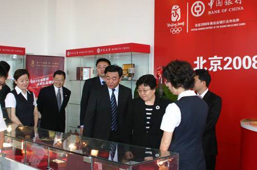 After the awarding ceremony, President Zhang and Mr. Xu made a visit on Aocheng Sub-branch and licensed Olympic products flagship store, and heard the report on Olympic financial services by Tianjin Branch.