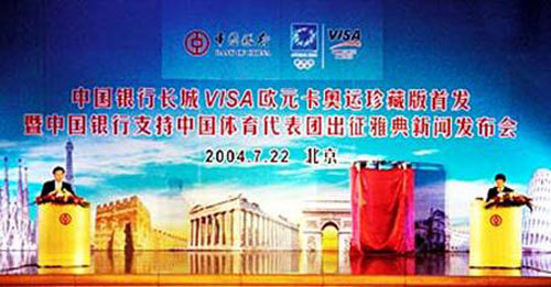 On July 14th, 2004, Bank of China was announced Banking Partner of the Beijing 2008 Games. Eight days later, backed by its pioneering advantage in international credit payment, the bank, in support of the Chinese Olympic Team, warmly presented the first Olympic thematic financial product to the public: the Great Wall Euro Visa Card for Athens Olympic Games Collector’s Edition.