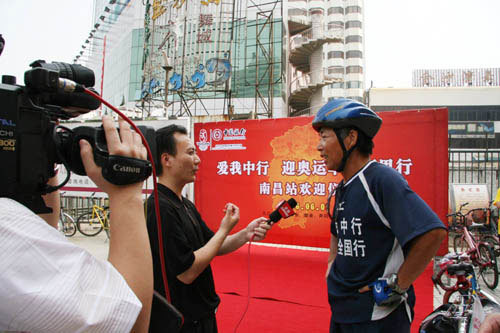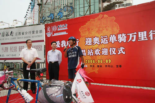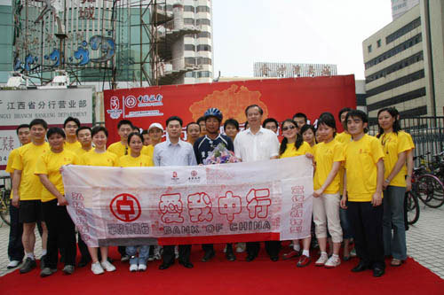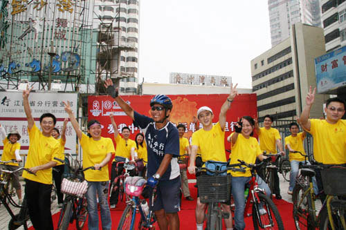 After that, a bicycle team of the branch, which is formed by young employees, go with Mr.Zhang making a round of Nanchang City promoting the Olympic spirit to local people. Furthermore, Mr. Zhang will continue to visit 10 districts inside Jiangxi Province on his bicycle.