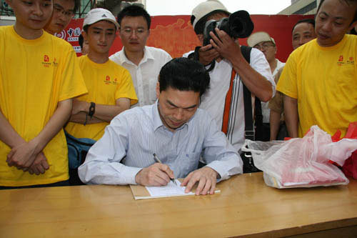 Mr. Fang Hongguang, attaches the bank seal and a motto to Mr. Zhang’s specific propaganda banner. And Mr. Shao Xiankang says, to become the partner of Olympic Games is a splendid achievement realized by BOC employees, who work hard from one generation to another, which fills the international golden brand with energy and passion. Mr. Zhang takes an active part in showing the society the heart and mind of the employees in BOC, and realized the connection of the spirit of BOC and the spirit of Olympic Games. It is called on that all the employees of BOC should take Mr. Zhang for an example, to go all out in work, and firmly integrate daily work with Olympic affairs for the improvement of the service quality of BOC, according to the Olympic spirit, that is, “Higher, faster, stronger”.