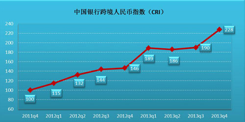 On February 18, BOC released the Cross-border RMB Index (CRI) for the fourth quarter of 2013. According to the statistics published by BOC, CRI in 4Q 2013 climbed up the 200 reading for the first time and stood at 228 points, reaching a historic new high, which marked the accelerated internationalization of RMB.