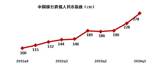On May 14, BOC released its cross-border RMB index (CRI) for the first quarter of 2014, which rose to 278 points, reaching a new high, up 22% over the fourth quarter of 2013, and up 47% as compared with the same period of 2013. The activity of RMB use at the three stages of "outflow, circulation and backflow" has been further enhanced. The cross-border outflow outpaced backflow, which generated a net outflow momentum and indicated heightened use of the currency overseas.