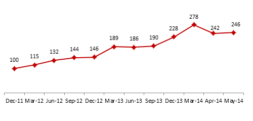 On July 12, BOC released the Cross-border RMB Index (CRI) for May 2014. The May reading of CRI was 246 points, up 4 points over last month, and up 18 points as compared with December 2013. The index rose slightly this month and continued the rising trend as a whole. RMB has maintained a net outflow in the cross-border circulation process, with overseas flows staying steady and the regional distribution of cross-border RMB settlement more in balance.