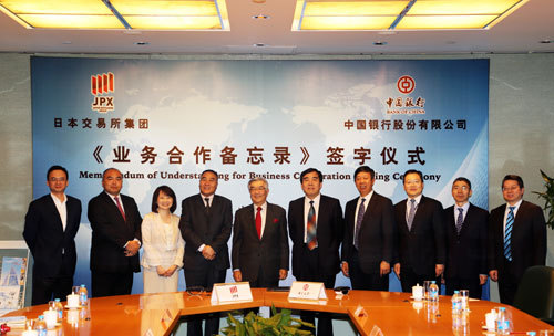 Lately, BOC Chairman Tian Guoli and Atsushi Saito, CEO of Japan Exchange Group (JPX) entered into a Memorandum of Understanding for Business Cooperation in Beijing, under which both sides will carry out extensive business cooperation in the R&D and trading of offshore RMB products, RMB fund clearing, securities custody, settlement membership, and RMB bonds, among others.