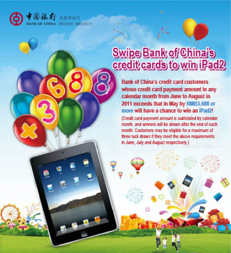 Bank of China's credit card customers whose credit card payment amount in any calendar month from June to August in 2011 exceeds that in May by RMB 3,688 or more will have a chance to win an iPad2 in the lucky draw.