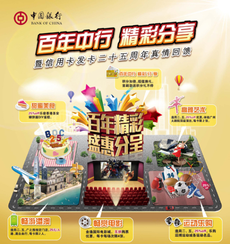- Customers who make card payment at appointed partners of Bank of China can enjoy the following preferences: 50% discount on movie tickets, tour to Hong Kong or Macau with RMB 25, 25% off for sports The preference will be offered on the "first-come, first-served" basis.