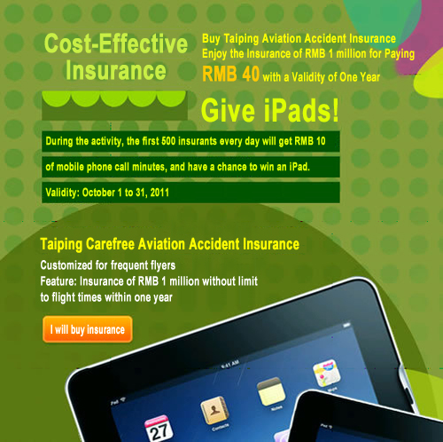 During the activity, customers who pay RMB 40 to buy the "Taiping Aviation Accident Insurance of RMB 1 million" via BOCNET Online Payment, will each get mobile phone call minutes worth RMB 10 and a chance to win an iPad.