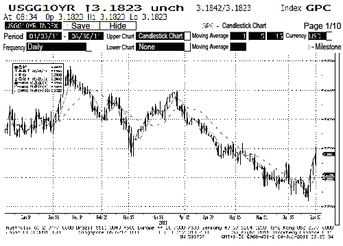 10-year U.S. treasury yield chart (January 3 to June 30, 2011)
