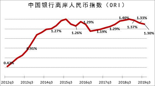 2019年三季度末中国银行离岸人民币指数(ORI)为1.30%,较2019年二季度末下降0.03个百分点,低于预期值0.05个百分点。