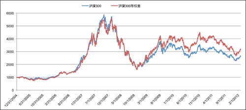 3.等权重加权法 把握行业机会:沪深300等权重指数通过等权重加权的方法,使沪深300所有样本股权重相等,个股与行业权重分布更为均匀,相对于市值加权方法,有效规避个别大市值股票权重过高对指数造成的影响,在较大程度上分散投资风险,分享整体市场成长的收益。沪深300等权重指数与沪深300指数相比,大幅度降低了金融地产行业的权重,同时提高了工业、公用事业与医药卫生等行业的权重,可以更加充分的分享小市值行业的成长收益。从长期走势来看,沪深300等权重指数具有更好的市场表现。