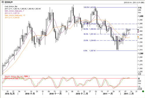 美国公布2月5日当周初请失业金人数降至38.3万人,优于预估41万人,美元指数全面上扬。在本周后半段美元呈反弹走势时,黄金虽然表现得较为抗跌,但美元的强势无疑为黄金反弹幅度的进一步扩大设置了障碍。周五纽约盘前金价持稳于1360-1365区间。若本周最后一个交易日仍无明显行情,则日线将呈连续三个十字排列,这将为下周变盘埋下伏笔。