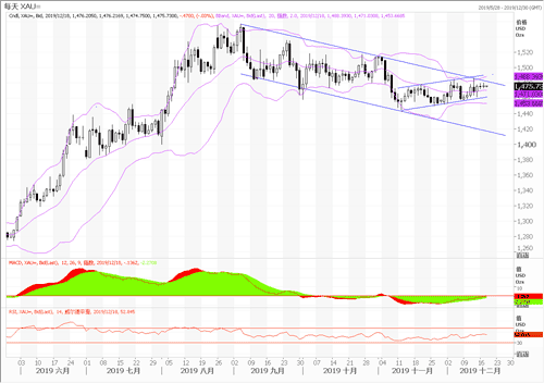 黄金价格近两天基本没有什么变化,一方面受到中美贸易关系缓和的压制,另一方面受到美元走弱的提振。而美国货币政策方面,更多美联储官员认为短期内无调整利率必要。美国达拉斯联储总裁柯普朗和波士顿联储总裁罗森格伦明确表态,支持美联储当前的立场,与上周其他决策者的措辞相呼应,即利率正在以最佳状态进入2020年,而且降息或升息的门槛会很高。受到言论影响,黄金未能收复1480美元一线。美国经济数据方面,美国11月新屋开工总数增加幅度大于预期,营建许可升至12年半以来新高,因抵押贷款利率持续提振房地产市场并支撑更广泛的经济。美国优异的非农数据,加上近期经济数据表现不错更加印证了美联储货币政策维持不变的论调。黄金的上涨动能有所削弱,上方关键压力是11月中和9月初两个通道的上沿1485-1490美元。如果不能突破,则仍然面临空头的威胁。