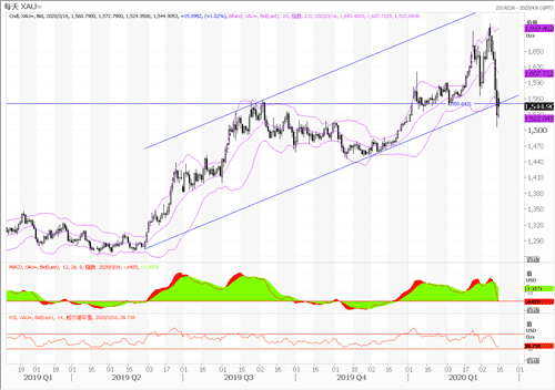 技术图上,黄金日线图跌破了去年5月底起始的上涨通道支撑线以及重要的水平支撑1550美元,日线RSI出现了顶背离,MACD快线跌至0轴,整体来看技术角度偏空。周末美联储突发宽松可能会引起黄金短线反弹,关注上方1560美元,如果不能上破后市可能还会下跌。下方支撑是1500、1450美元。不建议在现在刚跌破日线上涨通道后过早抄底。空头止损可放在1600美元上方。