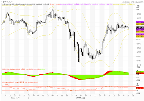 技术图上,黄金小时图25号至今维持了高位横盘的走势,在上周大涨后价格陷入了盘整,如果可以上破1645美元,突破上涨横盘区间上沿则可以打开新的上行空间,上方目标为前高1700美元。下方支撑是1610、1594美元,如果下破1594美元,则下方目标为1560美元。现在4小时图布林带收窄,上下方破位后都将可能走出较大的行情,因此应关注上下方阻力1645、1594美元的破位情况,破位后再跟多或跟空。