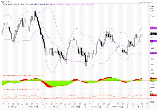 澳元连续第三天上涨,论中美贸易谈判缓和,澳币无疑是最受益的货币。从澳元/美元的周线图可以看出,自2018年来的单边下跌行情与中美贸易谈判进程异常吻合,因此,不能说现在是做多澳元/美元的最佳时机,但肯定是一个值得一试的买入点,因为短端澳洲国债收益率向上突破并进一步走高,以及其11月就业报告较为强劲,这都支持澳元继续走强。操作上建议现价介入澳元/美元多头,三成仓以下,若突破0.6927,则加仓至六成附近,目标0.7030,止损0.6850