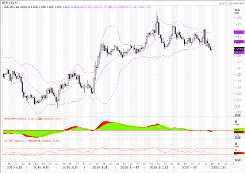 欧元兑美元继续延续跌势,跌破1.1重要关口后确认下跌行情,目前交投于1.0950附近。上周五,德国方面公布德国12月未季调贸易帐、德国12月季调后工业产出月率,数据显示德国12月季调后工业产出月率公布值为-3.50%,预期值-0.20%,前值1.10%。说明市场似乎对工业部门产出持悲观情绪,欧盟另一大巨头法国也公布法国12月工业产出年率 -3%,预期值1%,前值1.30%。法国工业产出数据显得比较差,而且跌至负值。唯一的光明面是法国经济对服务业的依赖程度要高得多。这与第四季度的数据有关,上周GDP意外的陷入萎缩。德、法两国工业产出表现大幅逊于预期凸显美欧经济基本面落差进一步加大。技术面,日线图欧元/美元跌破1.1后打开下行空间,前低变为1.09,1.13为头部的头肩顶形态非常明显,目前属于第二浪下跌。MACD绿色动能柱显现,布林带撑开下轨,显示仍有一段下跌空间,操作上建议三成仓进空单,目标1.09,止损1.0970。