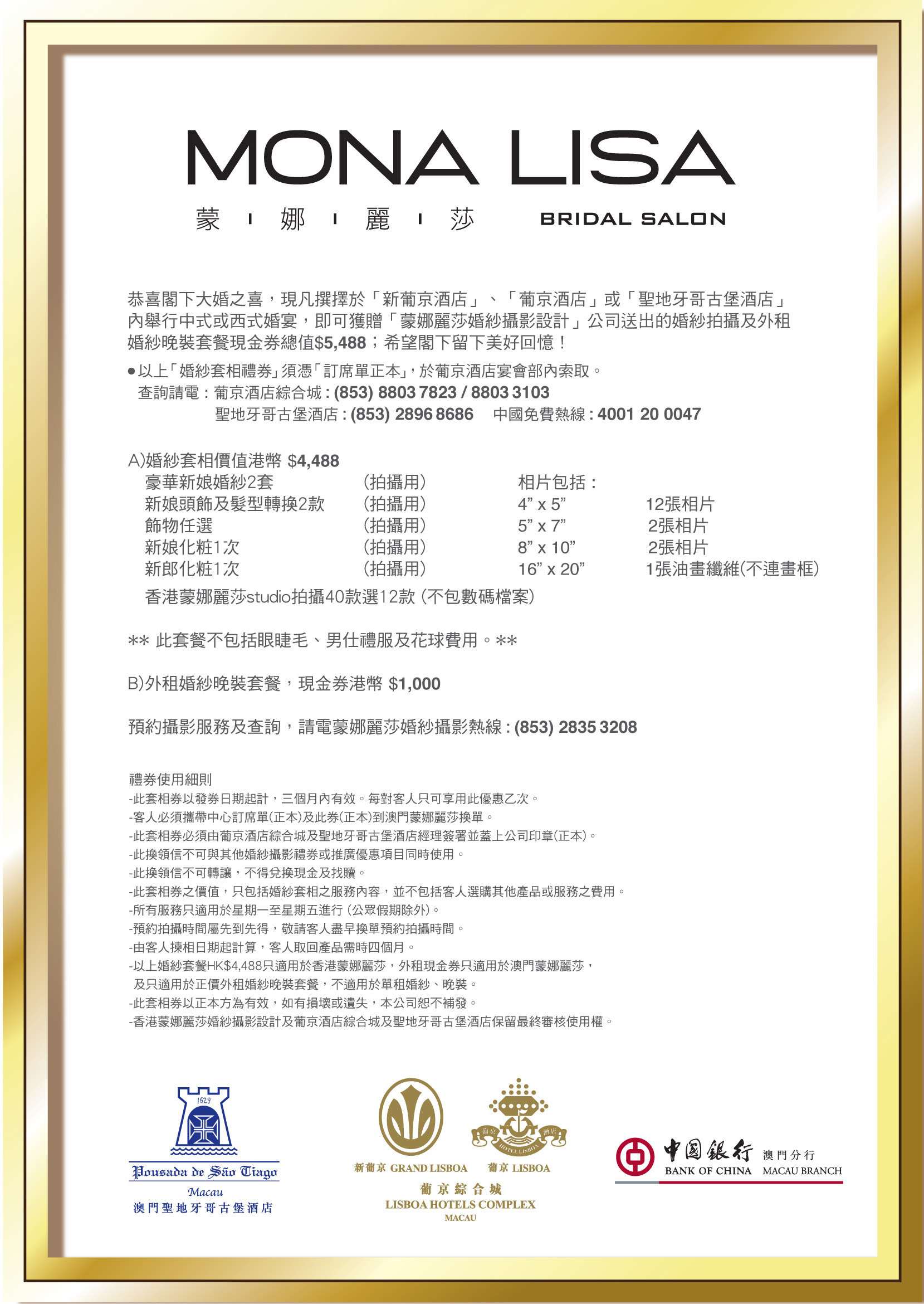 送總值 $5,488『蒙娜麗莎婚紗攝影設計』的婚紗拍攝及外租婚紗晚裝套餐現金券