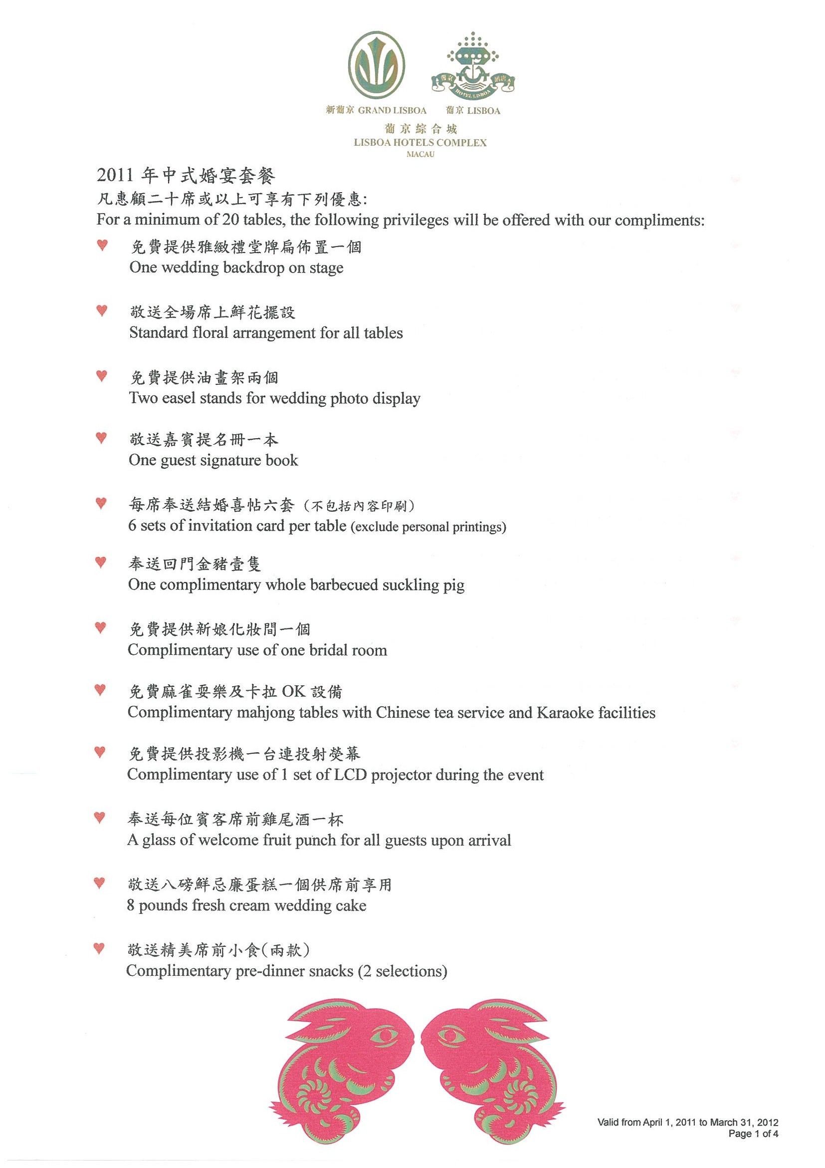 2. 凡於推廣期內惠顧上述婚禮或婚宴套餐,可享以下優惠: