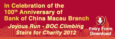To celebrate the 100th Anniversary of Bank of China, a series of sporting activities has been organized so that we can share these joyous moments with members of the general public. Meanwhile, in order to contribute more to the cultural and sporting development in Macau, we would like to join with you all kind-hearted people out there, to show the world that one of the greatest elements of our culture is that we all care about each other and will work together for charity!