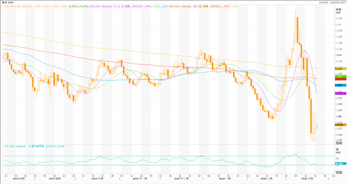 週一歐洲時段,歐元兌美元飆升120點至1.0800,其主要受益於美元指數的大幅回落,因美聯儲週一宣佈了無限量、無限期的量化寬鬆(QE)以及其它多項支持經濟和市場的措施,令美元下跌。鑑於新型冠狀病毒疫情在歐洲多地仍在快速蔓延,而英國與歐盟的脫歐事務談判代表雙雙被隔離,連德國總裡默克爾亦未能倖免。這使得歐洲市場信心極度黯淡。歐元近日的走勢雖然受壓但相比英鎊、澳元和加元都較堅挺,歐元兌美元於1.06附近有較大的支持。