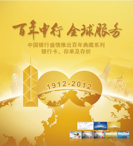 2012年2月5日,中国银行将迎来百年华诞。作为中国第一家连续经营100年的银行,中国银行始终保持着与全球经济脉搏的紧密联系,代表着中国的金融形象和发展实力。