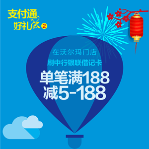 中行银联借记卡客户在沃尔玛超市持卡消费,单笔消费满188元,可享5元—188元的随机立减优惠。优惠名额总计21万名,先到先得,用完即止。
