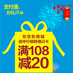 中行银联借记卡持卡人在京东商城消费满108元可享受立减20元优惠,数量有限,先到先得。