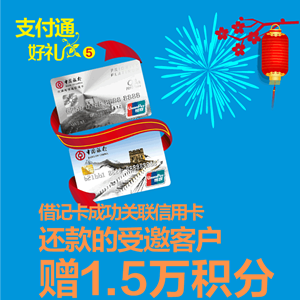 活动期间借记卡成功关联信用卡自动还款的受邀客户,即可获赠1.5万积分,每户仅限奖励一次。