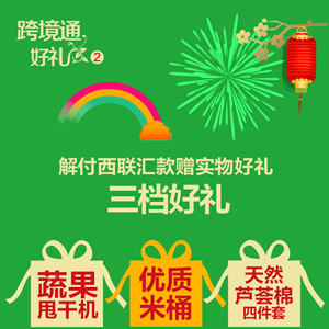 在我行网点解付西联汇款即有机会获赠实物好礼。礼品按价值分为蔬果甩干机、优质米桶、天然芦荟棉四件套三档,根据解付金额、是否同时签约自助渠道、是否同时结汇等确定礼品档次,先到先得,送完为止,详询当地中国银行。此外,客户还可在活动期间,从"个金微资讯"微信公众号链接进入西联中行春节幸运抽奖活动,即有机会赢取夏普50寸液晶电视。