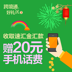 客户在指定地区(福建、浙江、广东、江苏、吉林、四川、宁波、苏州分行)首次通过自助渠道(网上银行、中银自助通、PAD终端)收取速汇金汇款,即可获赠20元手机话费。