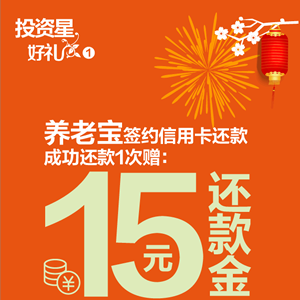 签约养老宝信用卡还款功能且成功还款1次的客户,可获赠15元还款金(以货币基金份额形式发放给客户),同时还有机会赢得当月信用卡账单免单大奖。