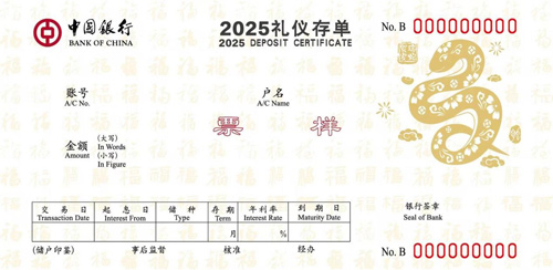 蛇年版2025礼仪存单和礼仪存折以蛇年生肖为主题,融合传统文化与现代审美,旨在为客户带来吉祥如意与财富聚集的美好寓意。