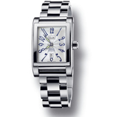 女式,机械自动机芯,白色表盘,大小为30.00mm*44.00mm,中央显示时分秒,星期显示位于12点钟方向,日期显示位于6点钟方向,弧形的蓝宝石水晶表镜,使方型表壳侧面更为抢眼。防水30米,不锈钢表带.(另有表盘大小为33.50mm*45.50mm和24.00mm*36.00mm的不同价格的相同款式.) |