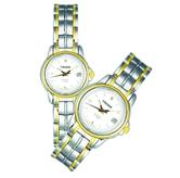 圆形外观,机械表芯,蓝宝石水晶玻璃镜面,钢质、镀金表壳,白色表盘,银色钢质黄色镀金表带,折叠式表扣,防水30米,日期显示功能