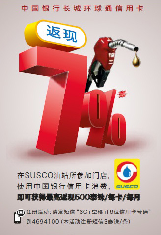 在SUSCO油站刷中行信用卡,获得现金返还7%。