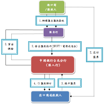 我行根據臺灣境外匯款銀行之指示將款項解付給指定收款人的業務,用於滿足個人法人之資金匯款結算需求。匯款方式包括電匯、信匯和票匯。目前常用的是電匯和票匯。