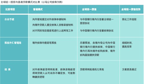 下表是在境内母公司担保的情况下,企业境外机构在当地申请贷款与使用我行全球统一授信产品对应的操作模式的对比: